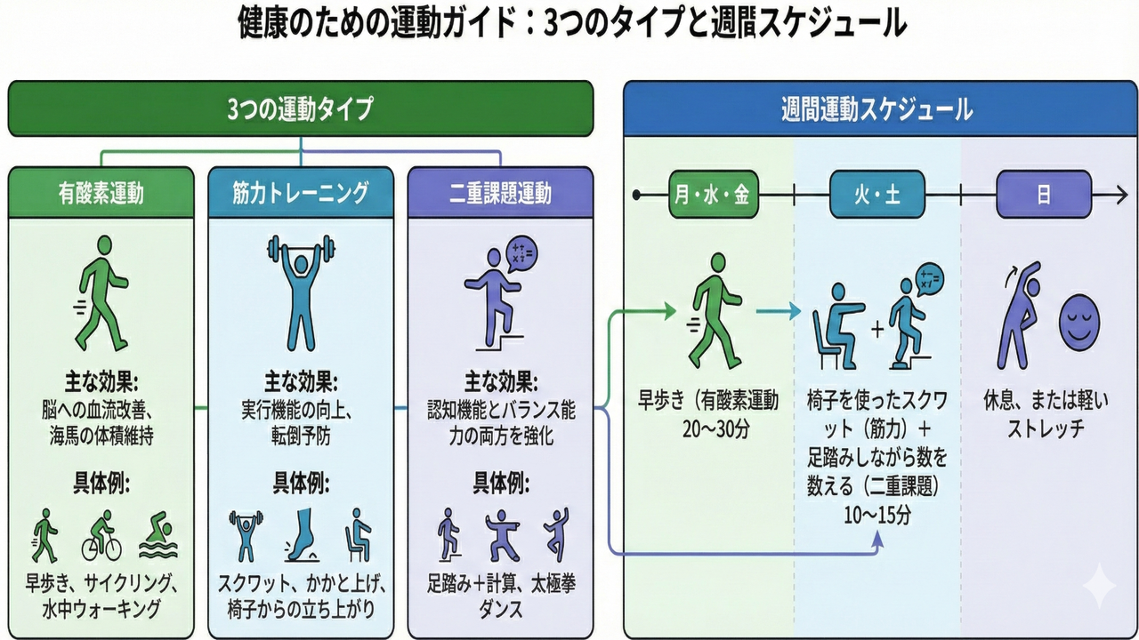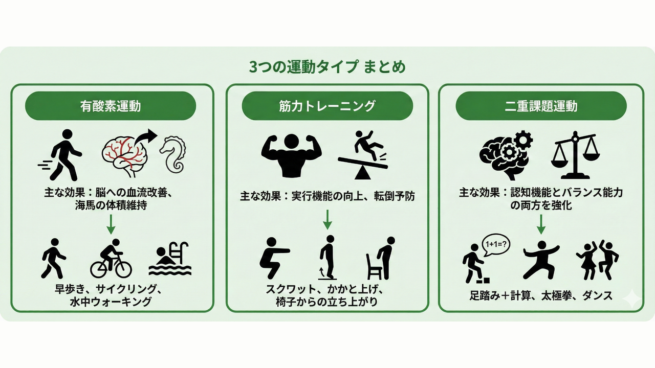 脳の健康を守るための運動は、「どれか一つをやればいい」というものではありません。役割の違う運動を組み合わせることで、より効果的に脳と体を守ることができます。